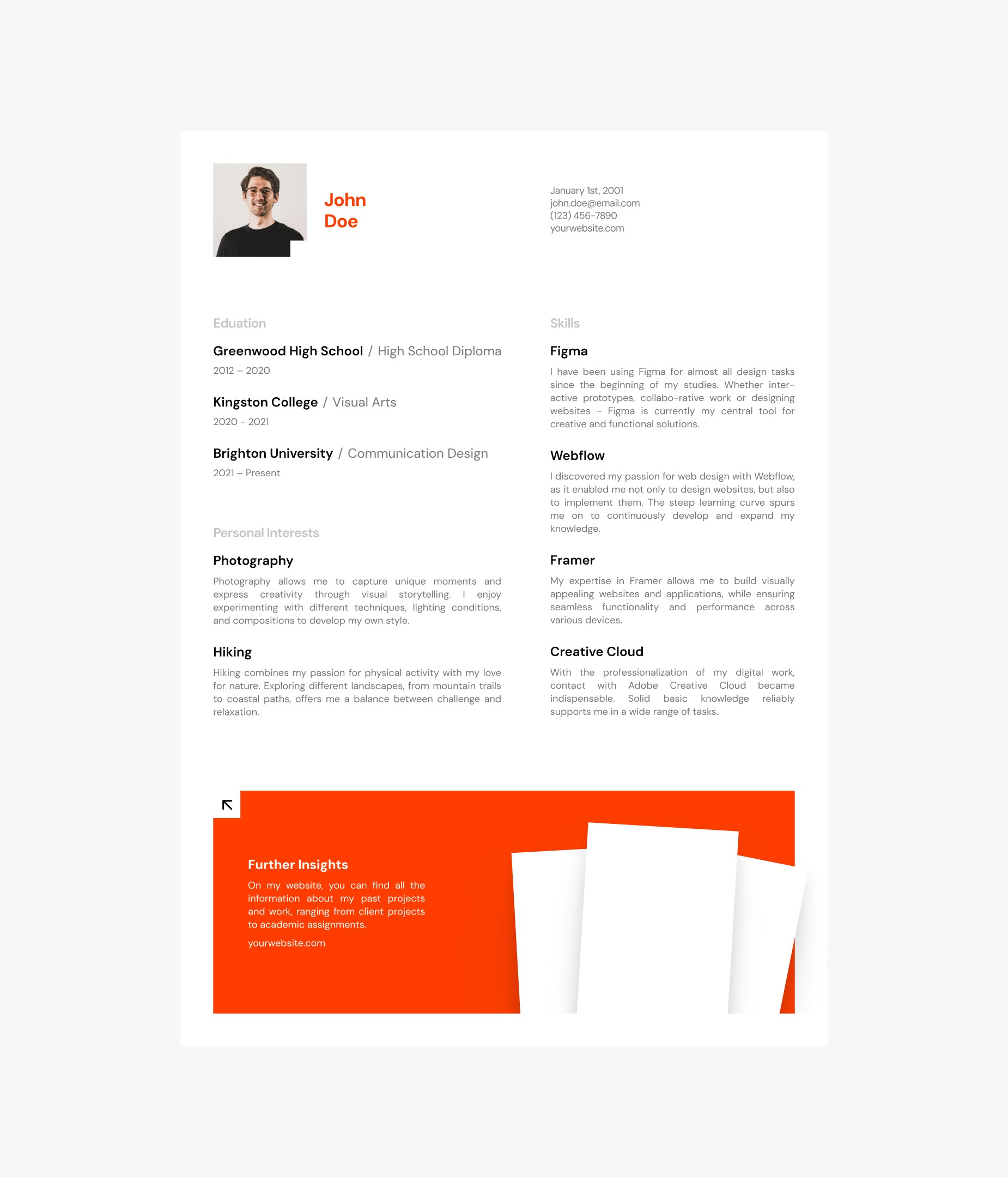 A sleek, simple, and modular Figma template for creating stylish resumes and CVs. With customizable sections and a variety of colors, it's perfect for showcasing your experience in a professional and visually appealing way.